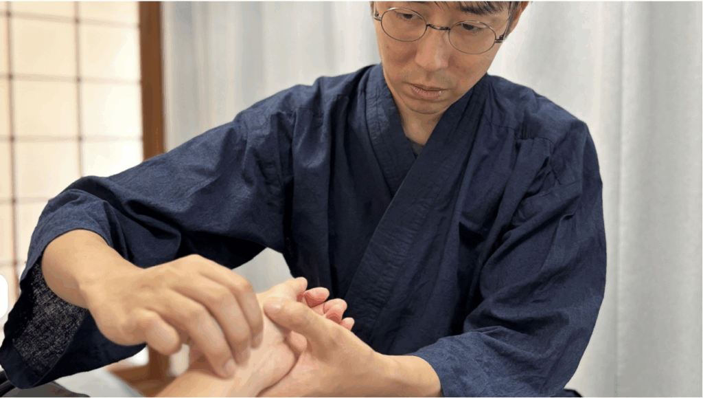 この画像は脈診(みゃくしん)といい、手首にある動脈に指をあてて触診し、身体の状態を探っているところです。